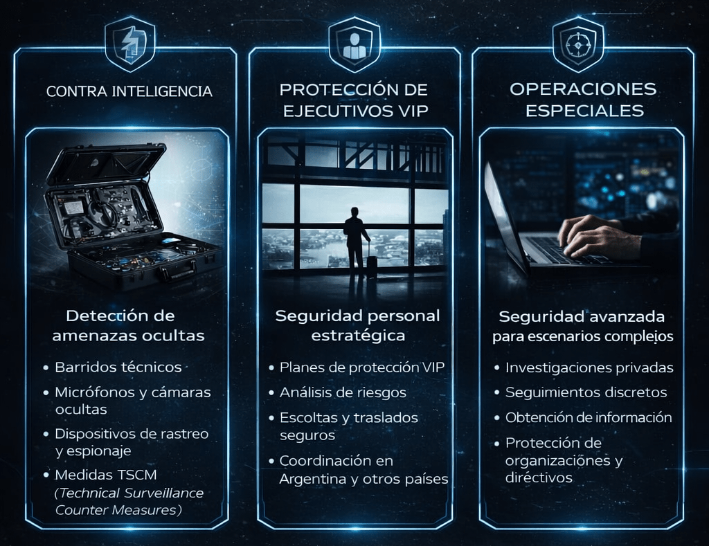 Brindamos prevención, detección y respuesta ante riesgos operativos, ejecutivos y estructuras sensibles, con enfoque personalizado.